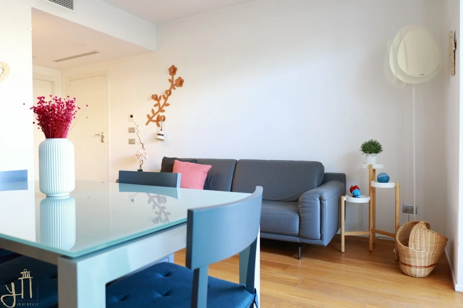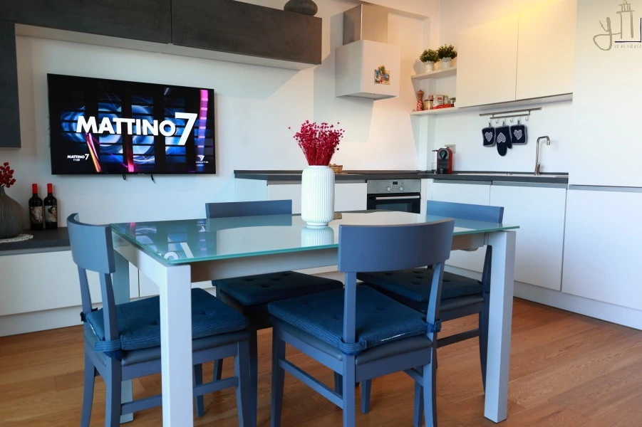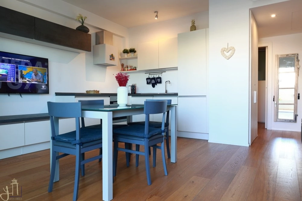 Proprio qui sorge una graziosa soluzione di recente costruzione, un rifugio intimo dove ogni dettaglio racconta comfort e bellezza: il soggiorno luminoso si apre su un angolo cottura funzionale, ideale per momenti di convivialità.