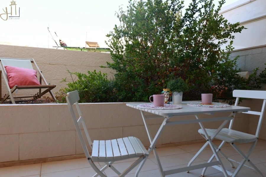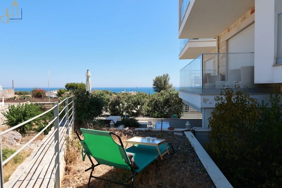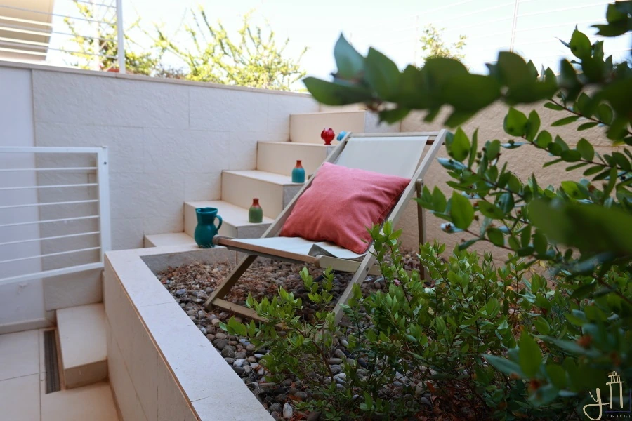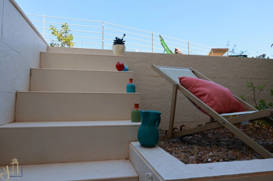 All’esterno, un comodo spazio terrazzato ti accoglie per momenti all’aperto e un piccolo giardino con vista sul blu del mare che si intreccia con i colori del cielo.